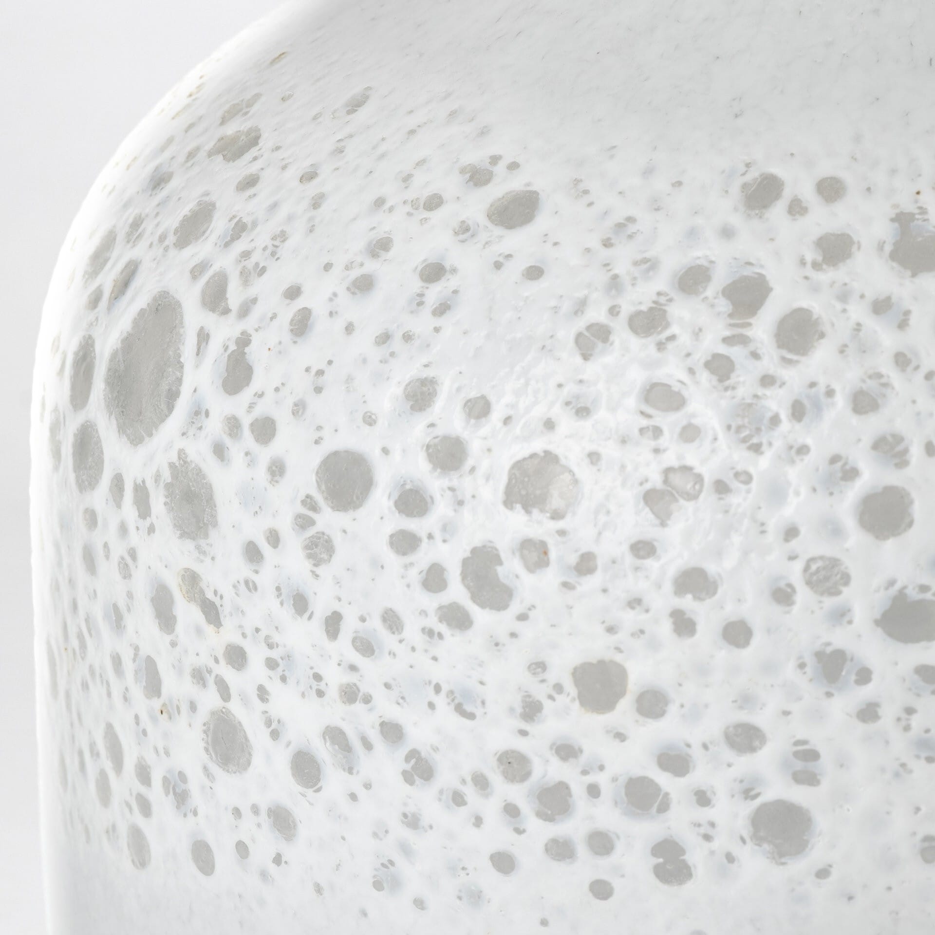 This Modern Pearl White Gold Rim Glass Vase is the perfect way to add a touch of contemporary design to any space in your home. The vase is made from glass and has a pearlised white finish in an anstract bubble and clear design that brings depth to the overall look of this vase. The body of the vase is in a rounded square bottle shape with a tapered golden rim narrower mouth. You can use to display floral arrangements or as a decor piece anywhere in your home. 8″ H x 8″ W x 8″ D